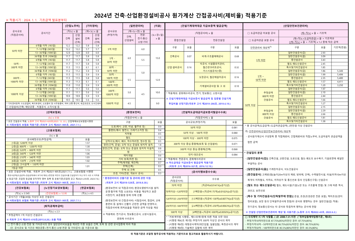 [문서서류:xlsx,pdf] 건축공사 산업환경설비 원가계산 간접공사비제비율 적용기준 양식 무료 다운 (2024.01.01 최신)