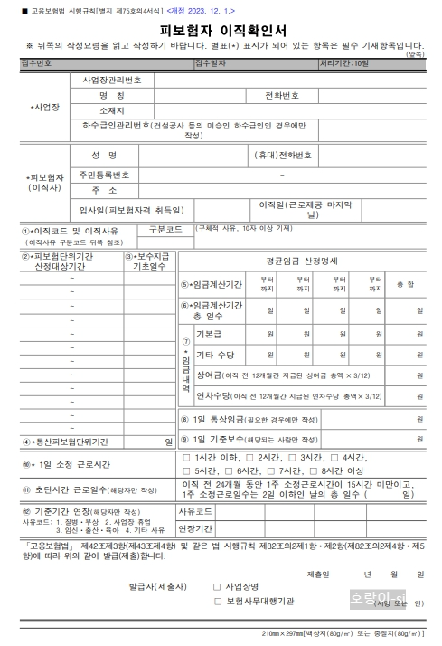 [문서서류:hwp,pdf] 피보험자 이직확인서 양식 다운로드 (최신 고용보험법 시행규칙 별지 제75호의 4서식)